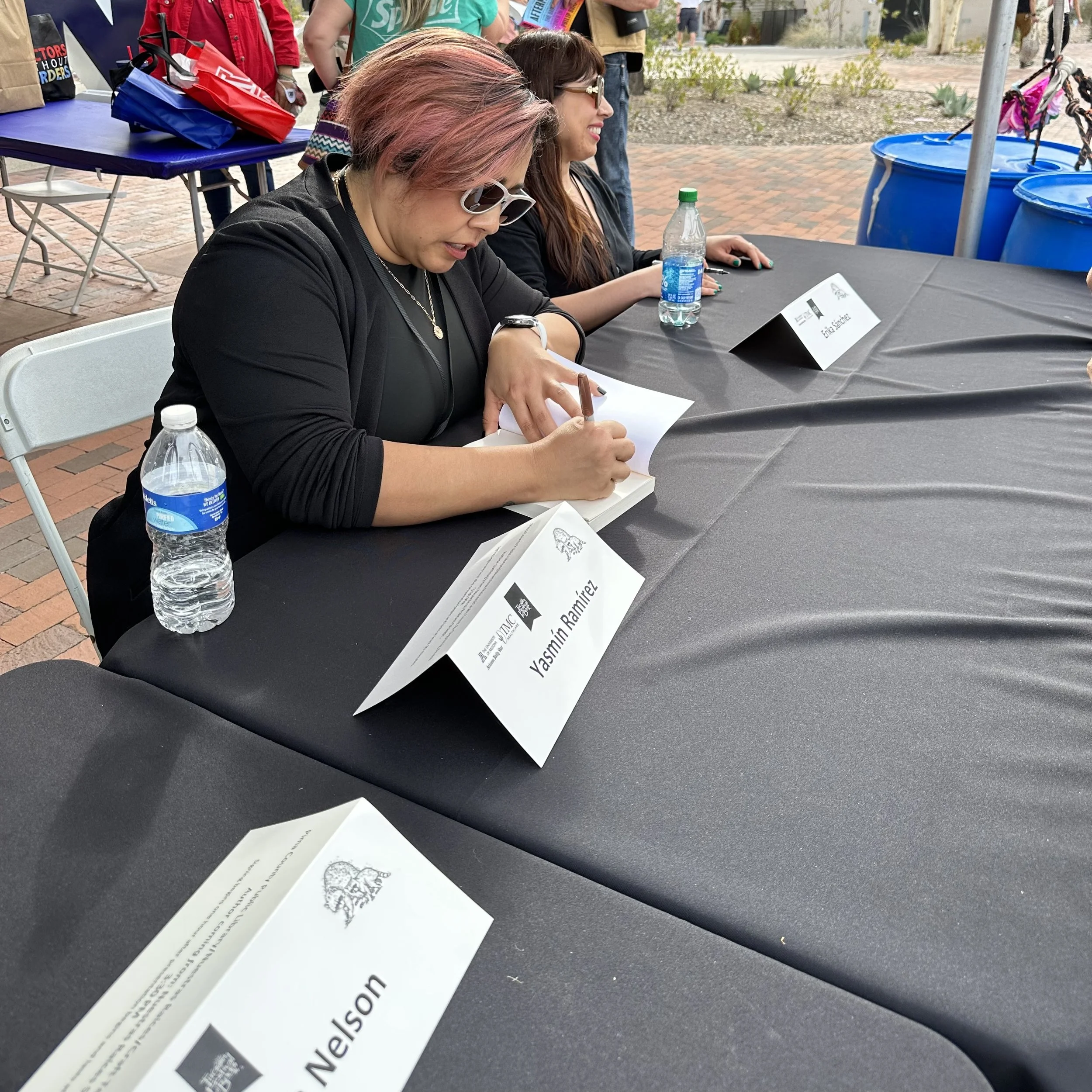 Yasmín Ramirez (left) signs a copy of her first book, "¡Ándale, Prieta!" outside the Nuestras Raíces tent. Ramirez is an Associate Professor of English, Creative Writing, and Chicanx Literature at El Paso Community College.